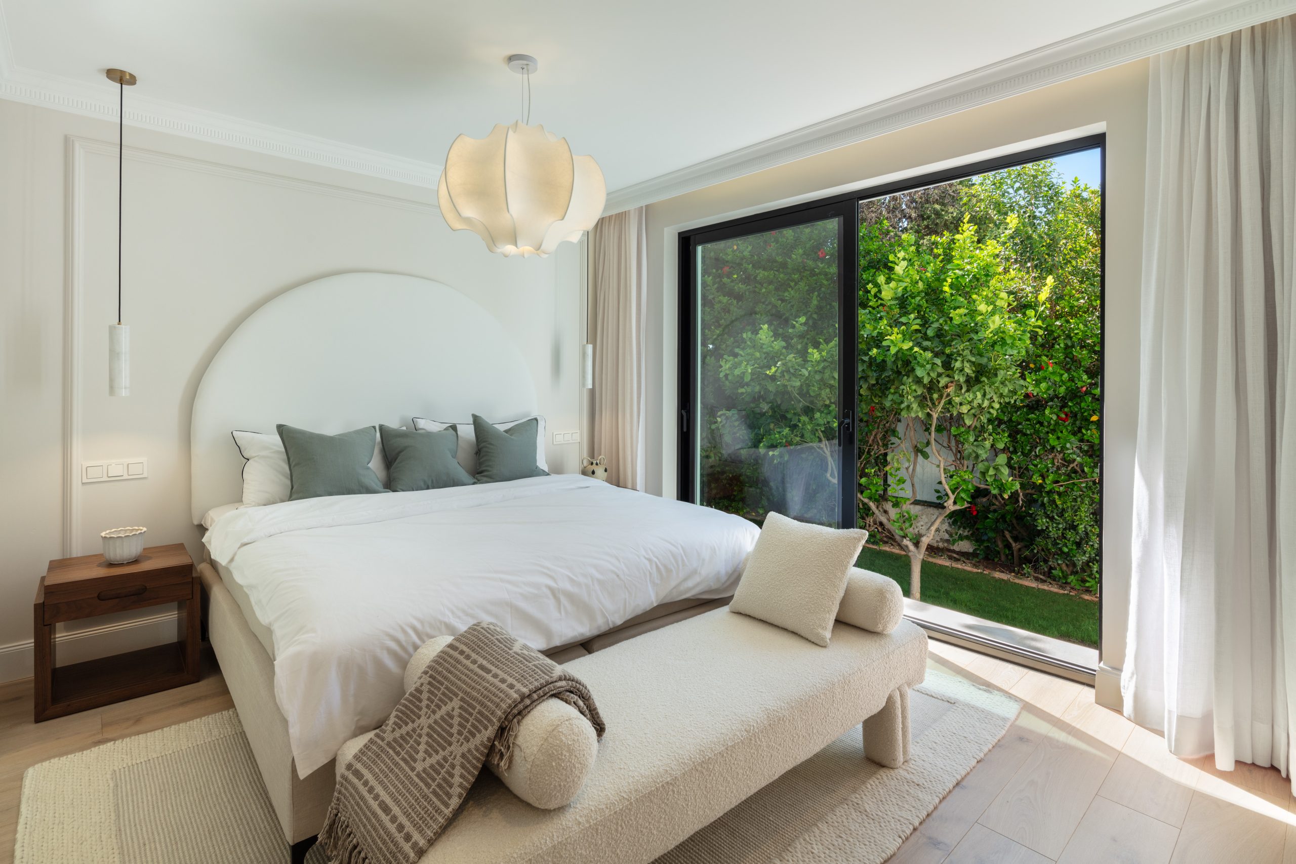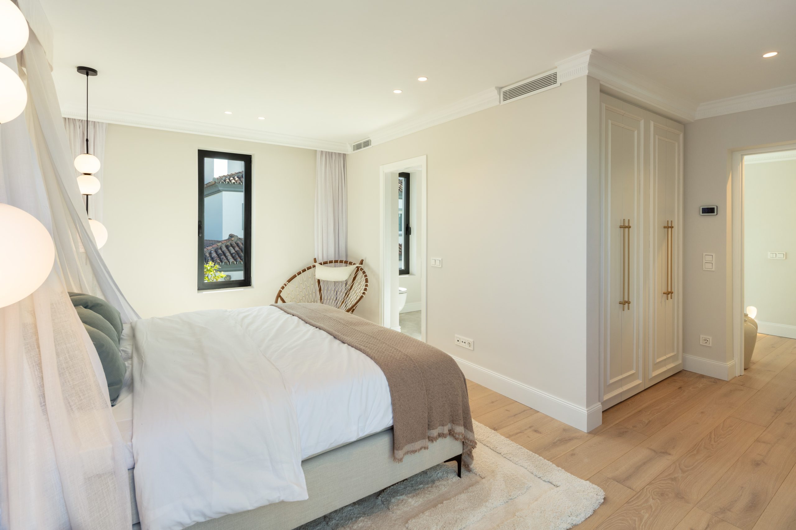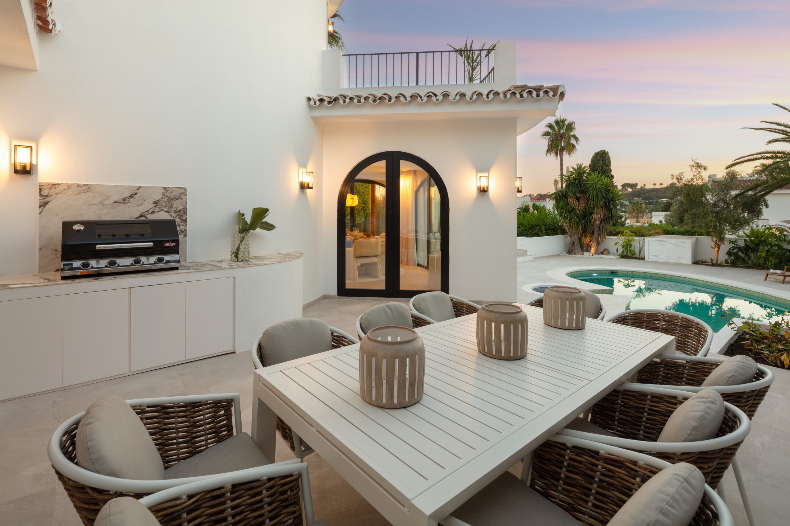 This captivating villa impresses with its unique architectural design, featuring a dome-like structure at the heart of its exterior facade. Its white walls and traditional Andalusian roof tiles add a touch of classic charm. The property offers an array of outdoor terraces, perfect for alfresco dining, BBQs and relaxed chill-out areas, allowing residents to enjoy Marbella's pleasant weather throughout the year. Surrounded by lush greenery, the villa ensures utmost privacy from neighbouring properties. The pool's distinctive shape, connected to a jacuzzi, adds visual appeal.