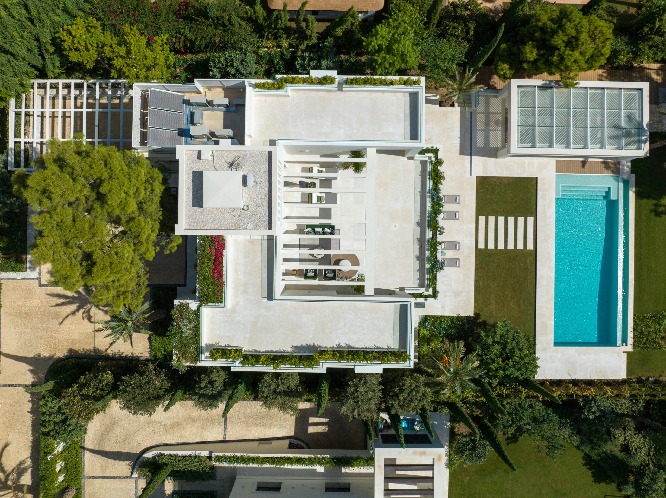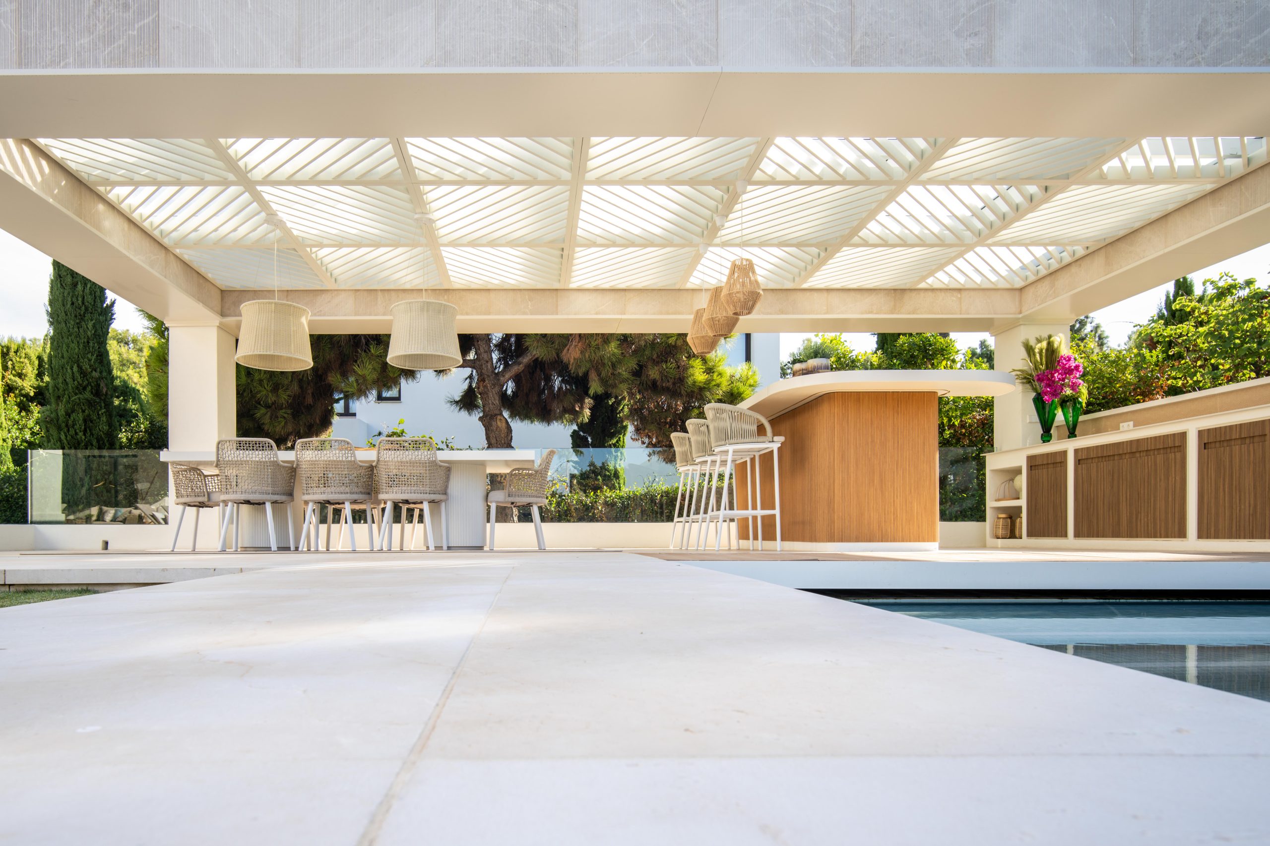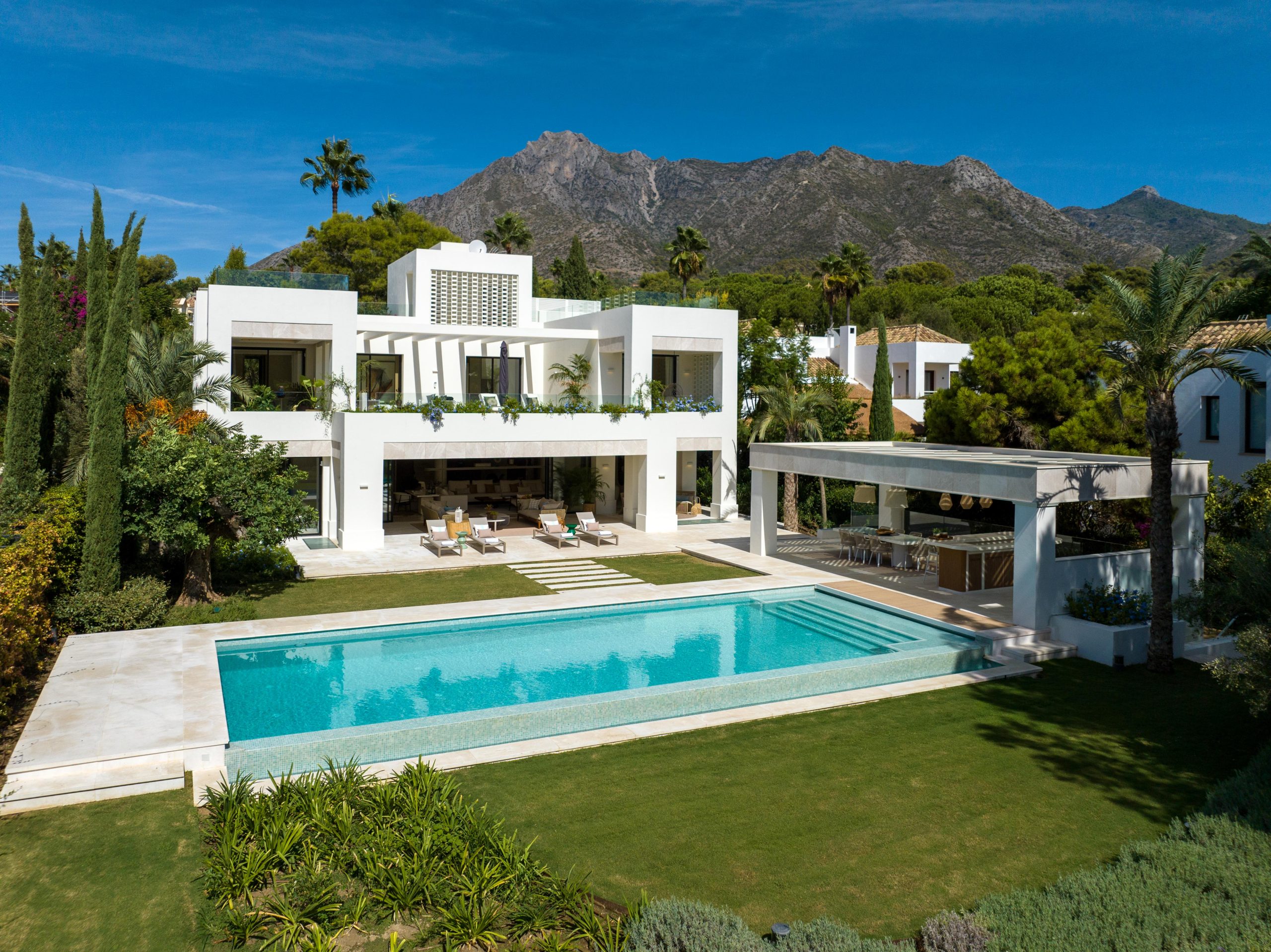 This spectacular villa enjoys a privileged location within the serene gated community of Altos Reales on Marbella’s Golden Mile. Sitting on an ample plot with stunning landscaping by Luis Vallejo, this property benefits from a southeastern orientation, meaning that the property is bathed in natural sunlight for the majority of the day. A large private pool and inviting outdoor terraces add allure to the garden, as well as catering to chill-out areas and an exquisite covered alfresco dining area with an outdoor bar.