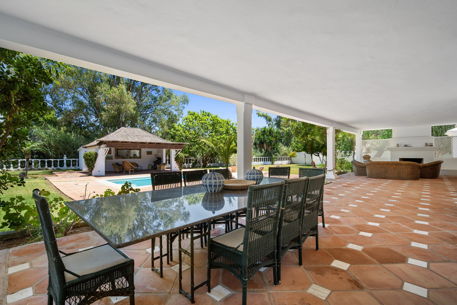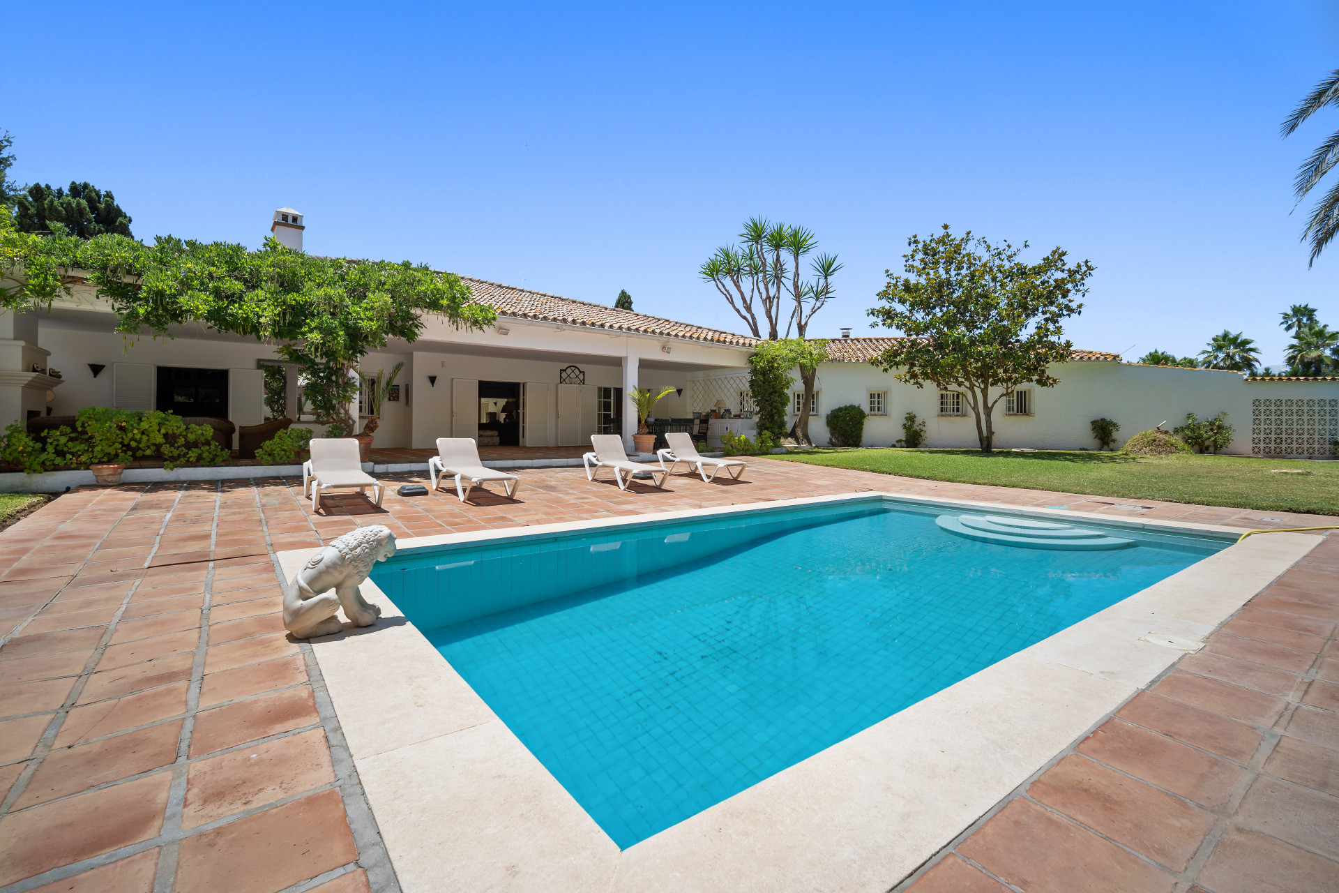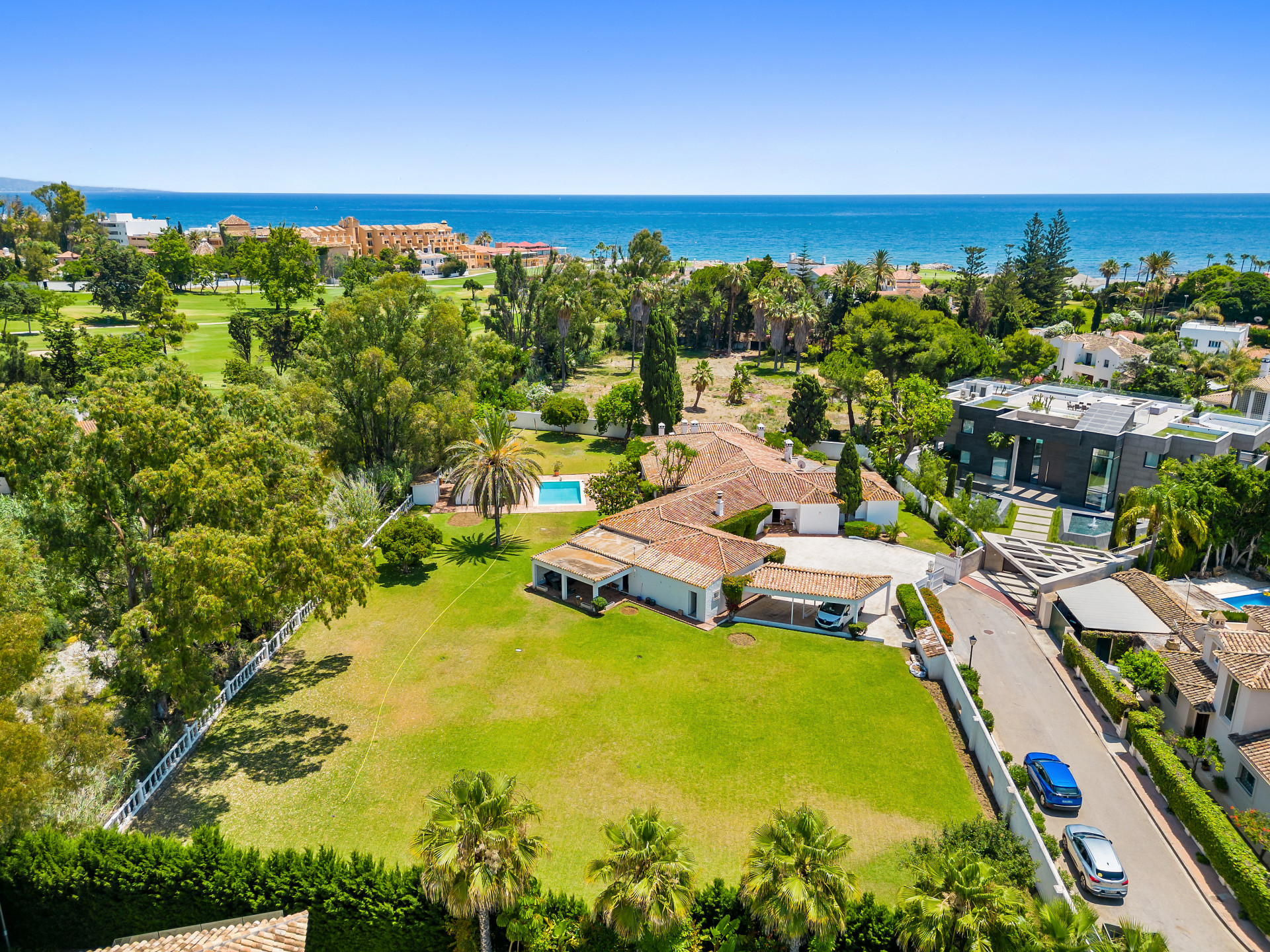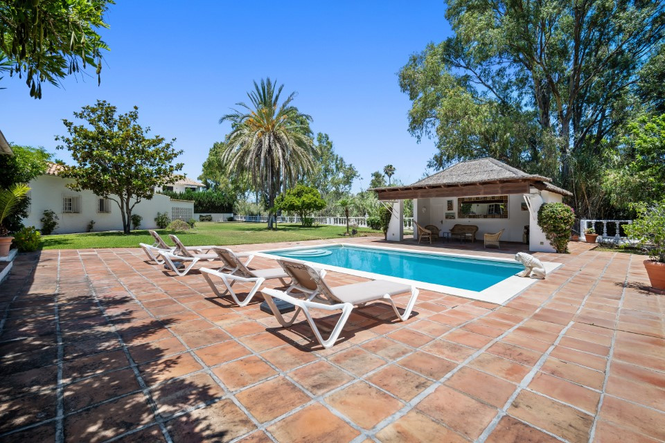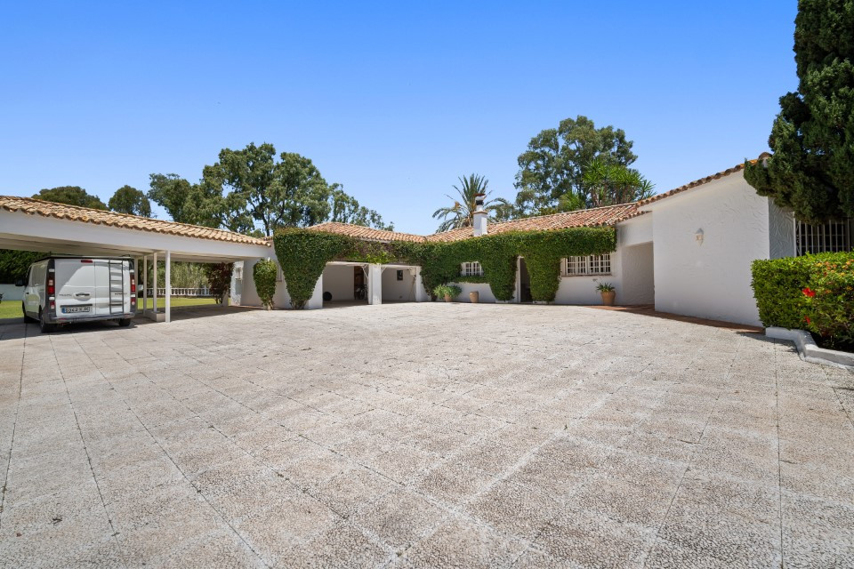 A fantastic investment opportunity located in Guadalmina Baja, just five minutes from the beach! This property is set on a large plot of 4100m2 and has the possibility to remodel and build another level or divide the plot to construct two or more independent villas. Currently the villa is distributed over one level and consists of a large living room with built in fireplace; dining room; fully fitted kitchen; master suite with lounge area and walk in wardrobe; guest suite; two guest bedrooms; two guest bathrooms; and an independent apartment for service with three bedrooms; two bathrooms; kitchen; living area; and laundry room. The property has well-kept gardens, private swimming pool and a covered BBQ area with outside toilets. Other features include hot and cold air conditioning in the master suite, double garage, double car port, shutters on the windows and fitted wardrobes.